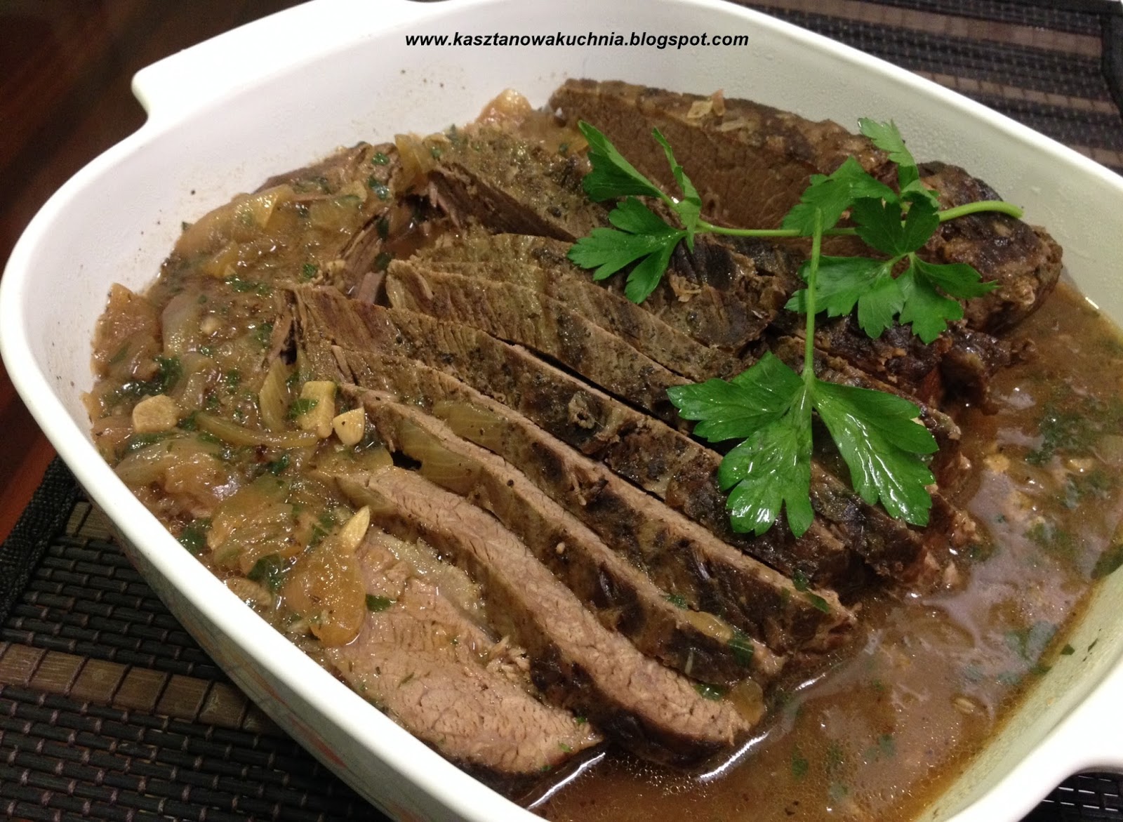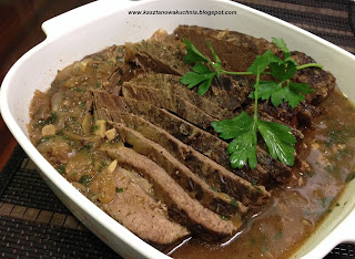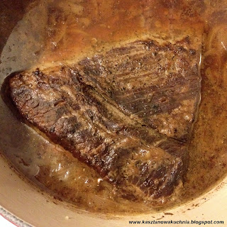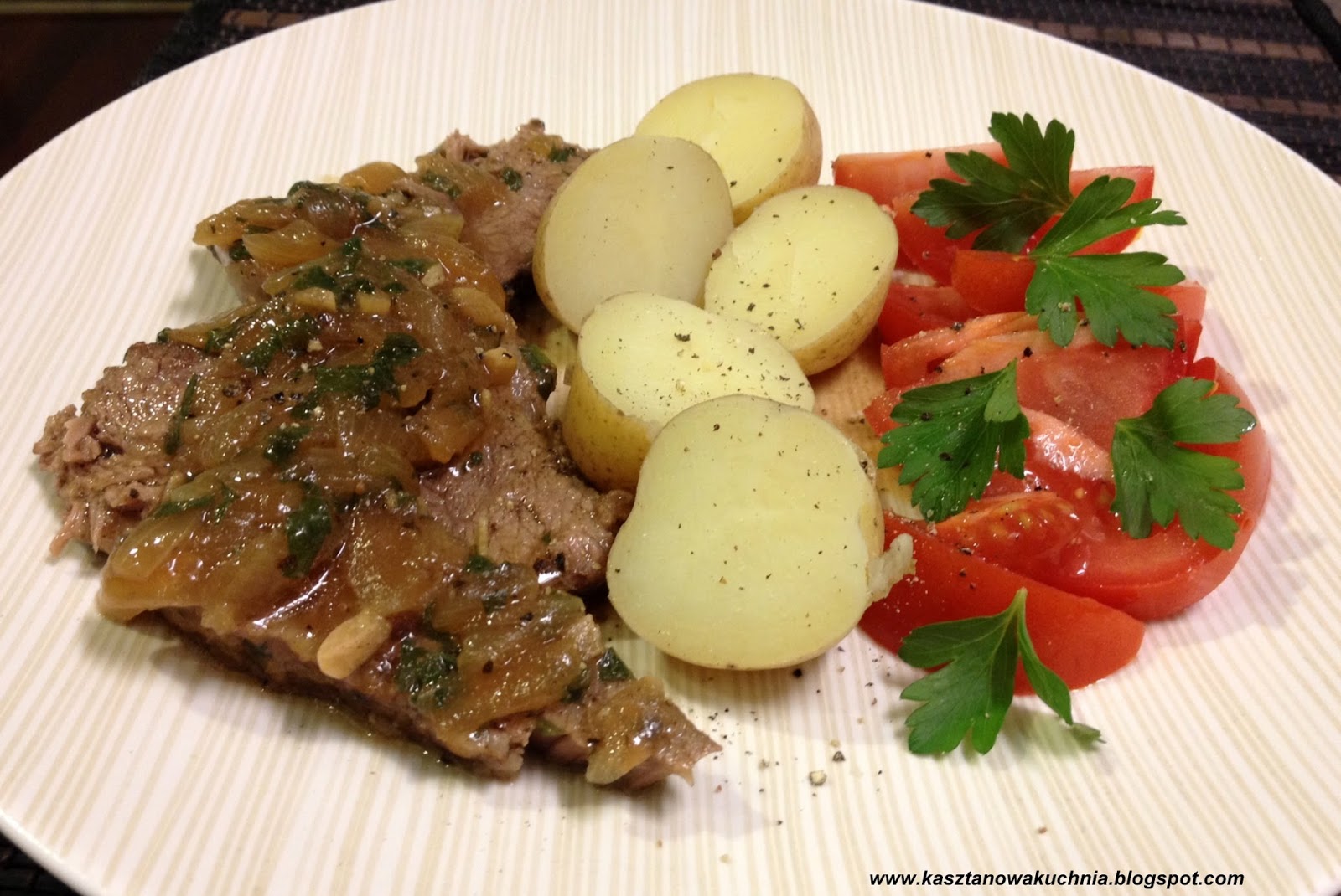 Cześć =) Mostek wołowy, jest twardym mięsem wymagającym wielogodzinnego duszenia lub pieczenia. Ale efekt końcowy zdecydowanie wynagradza godziny czekania. Mięso staje się bardzo delikatne, o przyjemnej włóknistej, lecz miękkiej strukturze i wspaniałych walorach smakowych. Dziś Kasztanowa Kuchnia zaprasza na mostek wołowy duszony z cebulą. Opcjonalnie można wrzucić do duszenia kilka suszonych grzybów, których smak świetnie komponuje się z wytrawnym, wołowym sosem =)