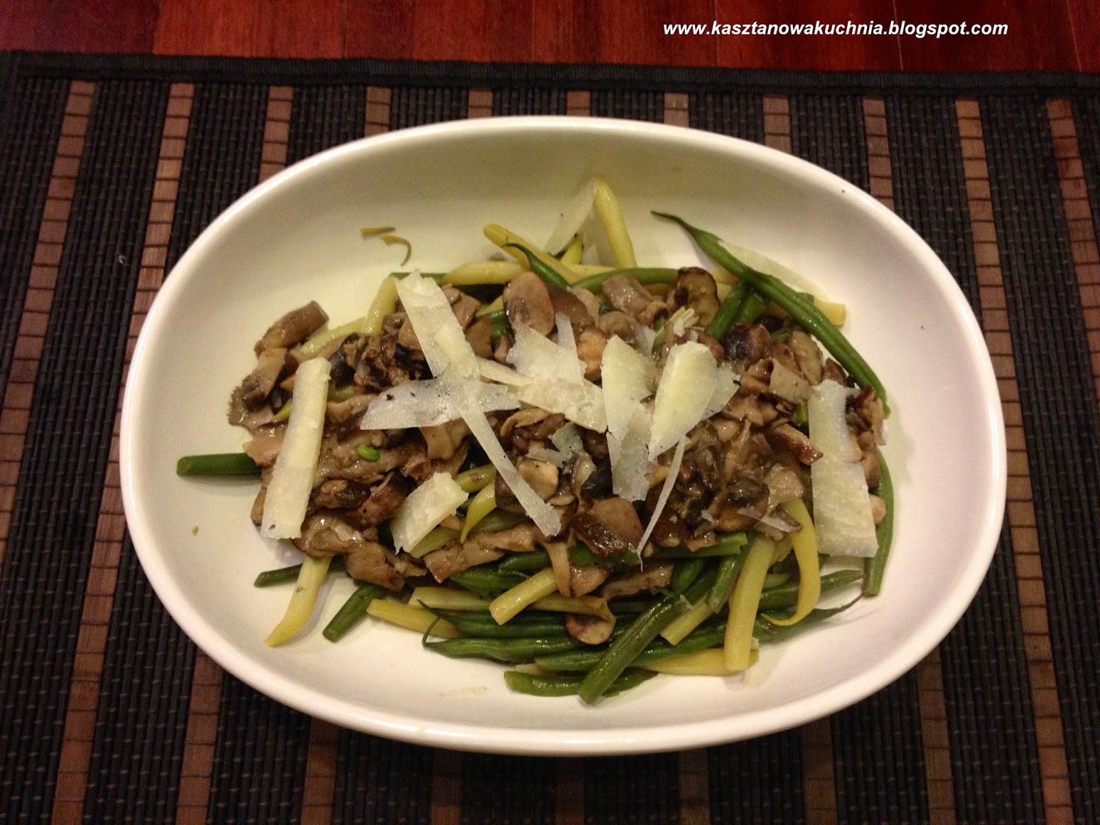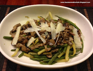 5) Wykładamy fasolkę na półmisek lub talerze, a na wierzch resztę grzybów z patelni.