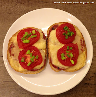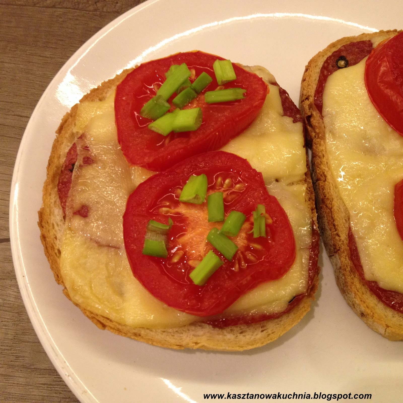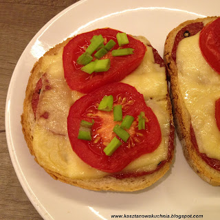 Jednak ja, mówiąc "grzanki", czy myśląc o grzankach - mam przed oczami i na myśli konkretny typ grzanek, czyli takie grzanki, które kojarzą mi się z czasami licealnymi, z Inowrocławiem i wczesną jesienią. Grzanki z salami, serem, cebulą (lub szczypiorkiem) i pomidorami (lub ketchupem).