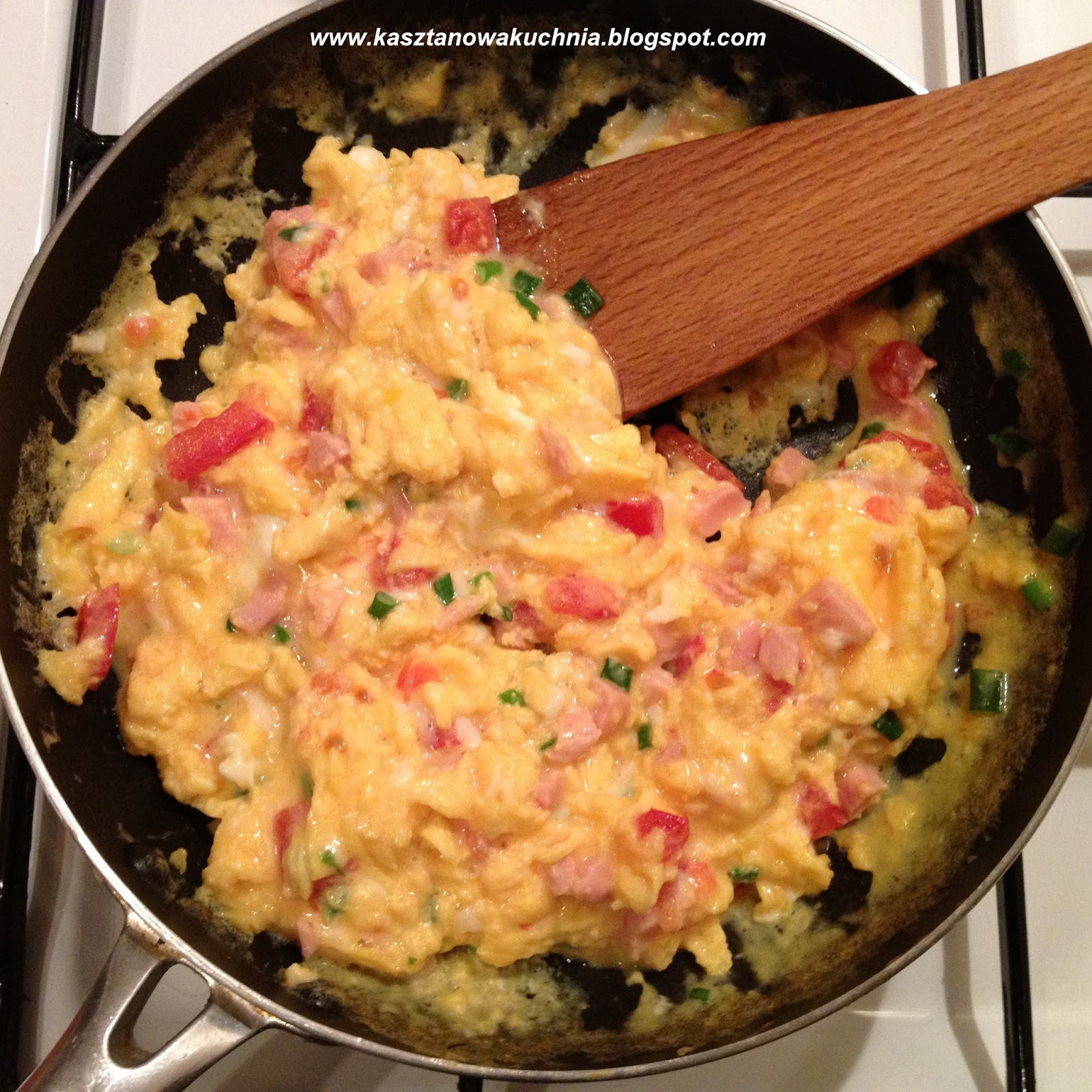 Cześć =) Jajka, to jeden z najbardziej wartościowych i smakowitych produktów żywnościowych. Można z nich wymyślać nieskończone ilości coraz to innych dań i kombinacji smakowych. Dziś zapraszam na jajecznicę na maśle, z dodatkiem szynki, pomidora i szczypiorku.