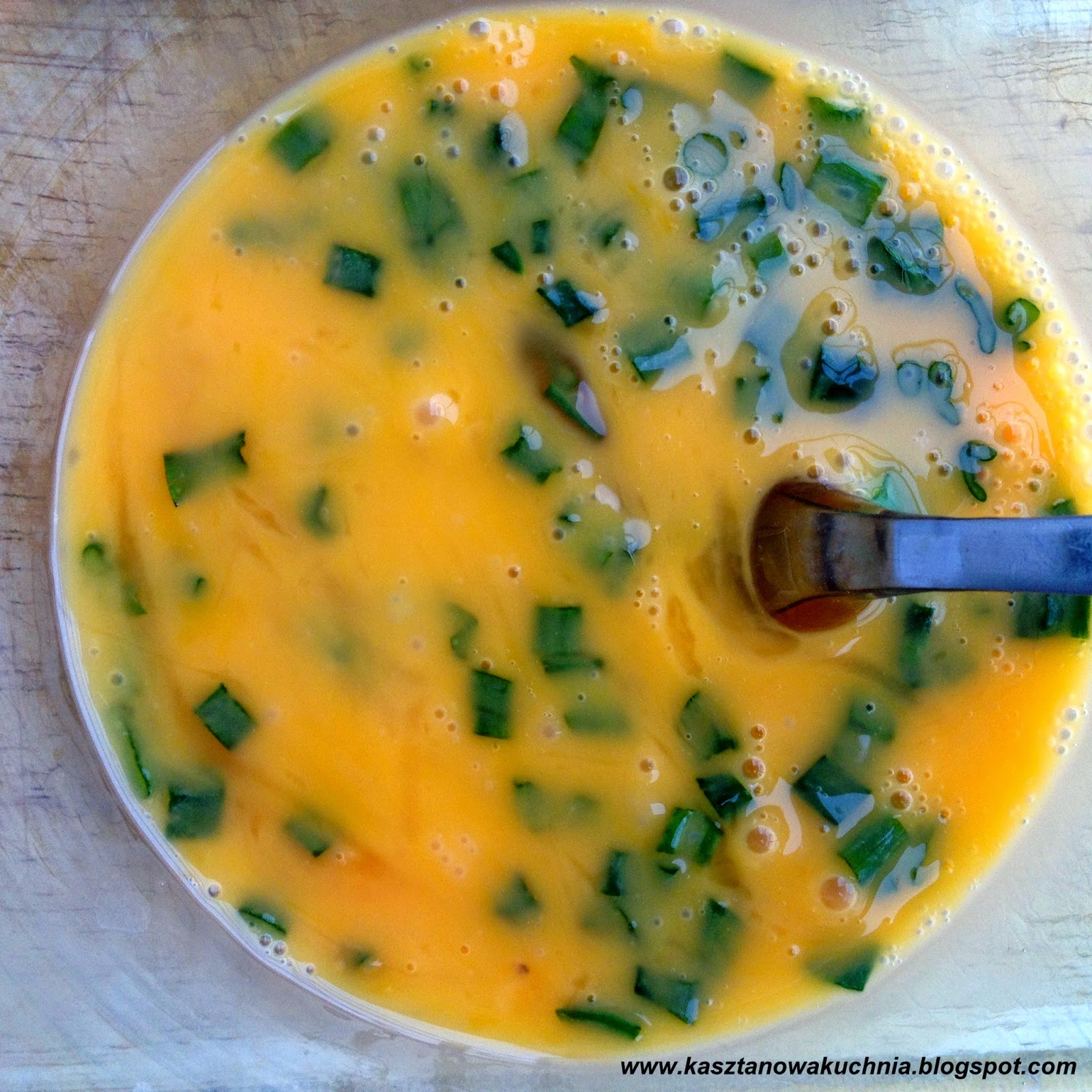 1) Do miski wbijamy jaja, posiekany szczypiorek i szczyptę soli, a następnie całość rozbełtujemy.