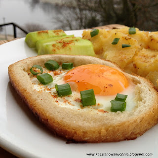 Jajka sadzone podajemy z wybranymi dodatkami. W tym przypadku prezentuję jajka sadzone w chlebie, podane z smażonymi ziemniakami i zielonym ogórkiem.