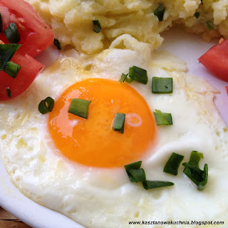 Jajka sadzone podajemy z wybranymi dodatkami. W tym przypadku prezentuję jajka sadzone z młodymi ziemniakami ugotowanymi na parze zmieszanymi z łyżką masła, 2 łyżkami i śmietany i szczypiorkiem oraz z pomidorem malinowym, a do popicia podałem zimną maślankę.