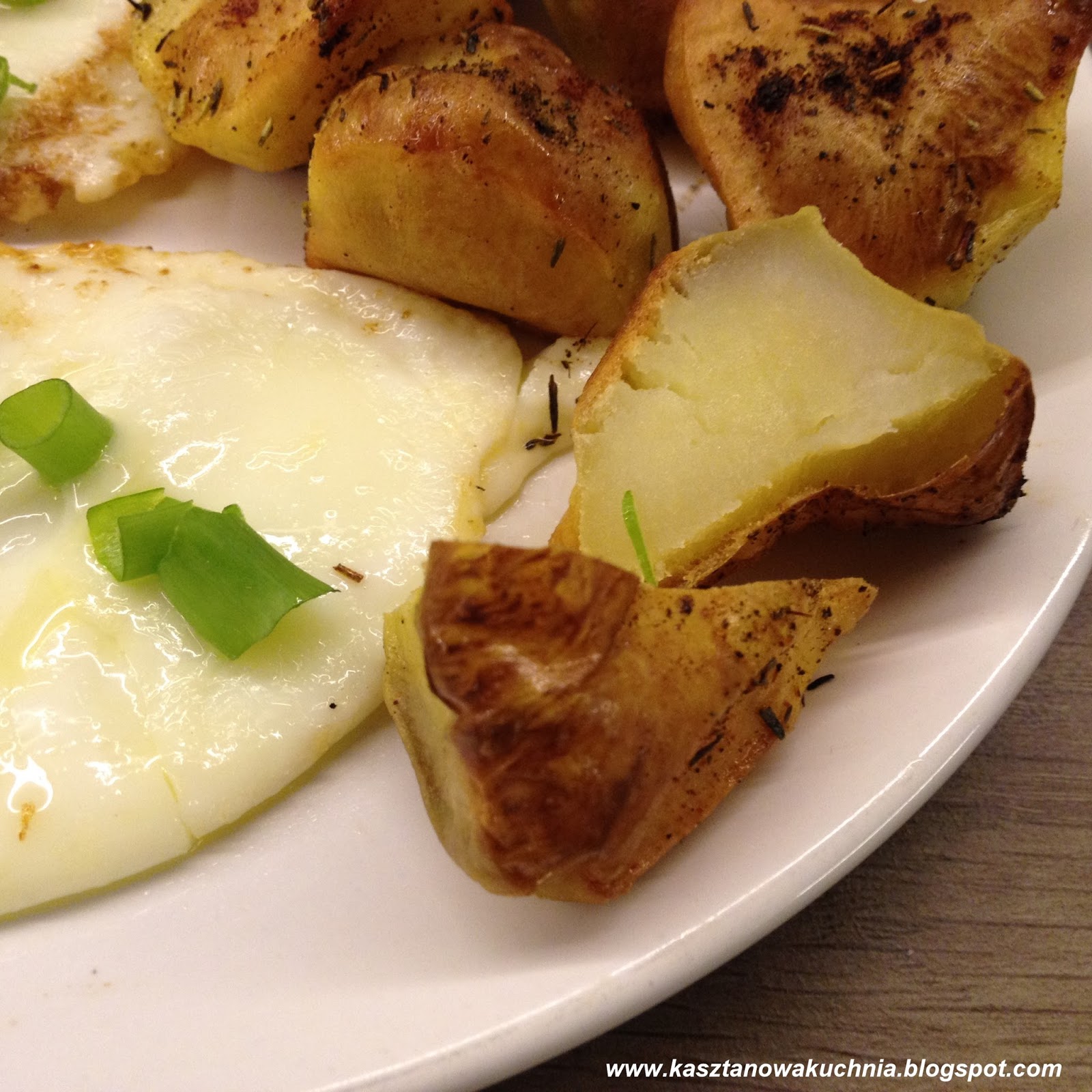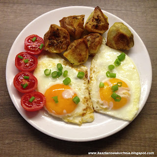 Jajka sadzone podajemy z wybranymi dodatkami. W tym przypadku prezentuję jajka sadzone podane z ziemniakami pieczonymi w ziołach oraz pomidorkami koktajlowymi.