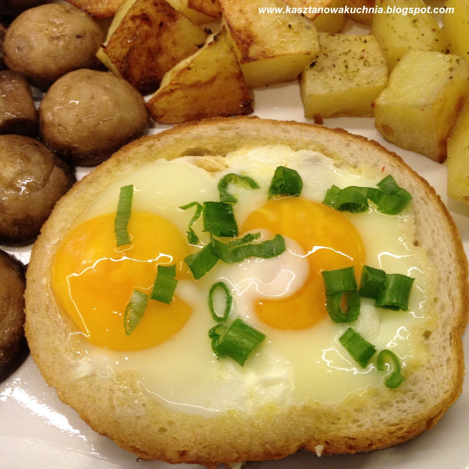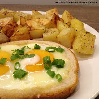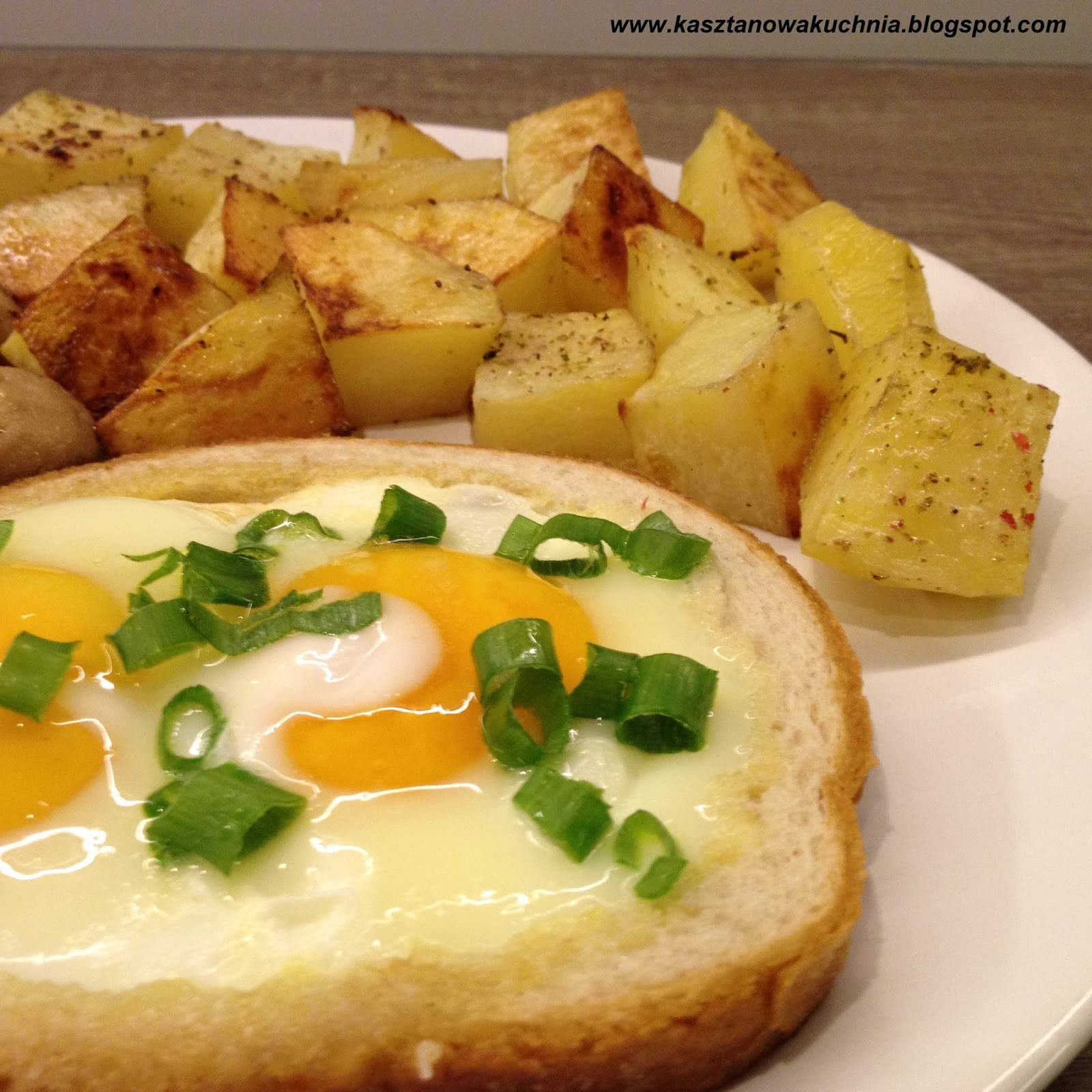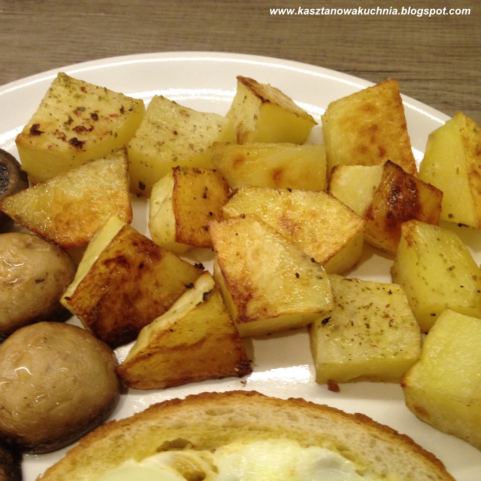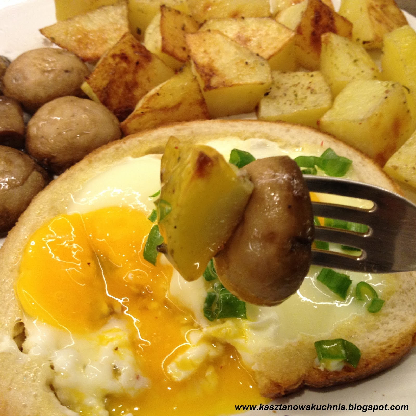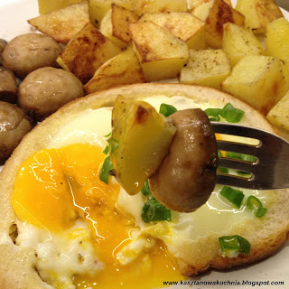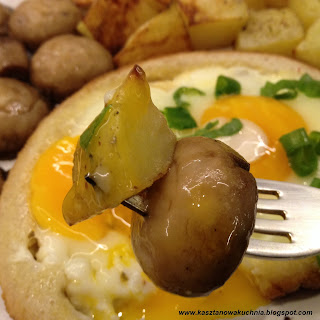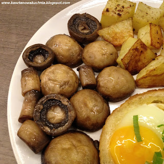 Jajka sadzone podajemy z wybranymi dodatkami. W tym przypadku prezentuję jajka sadzone podane z ziemniakami pieczonymi w ziołach oraz smażonymi pieczarkami.