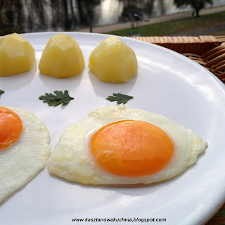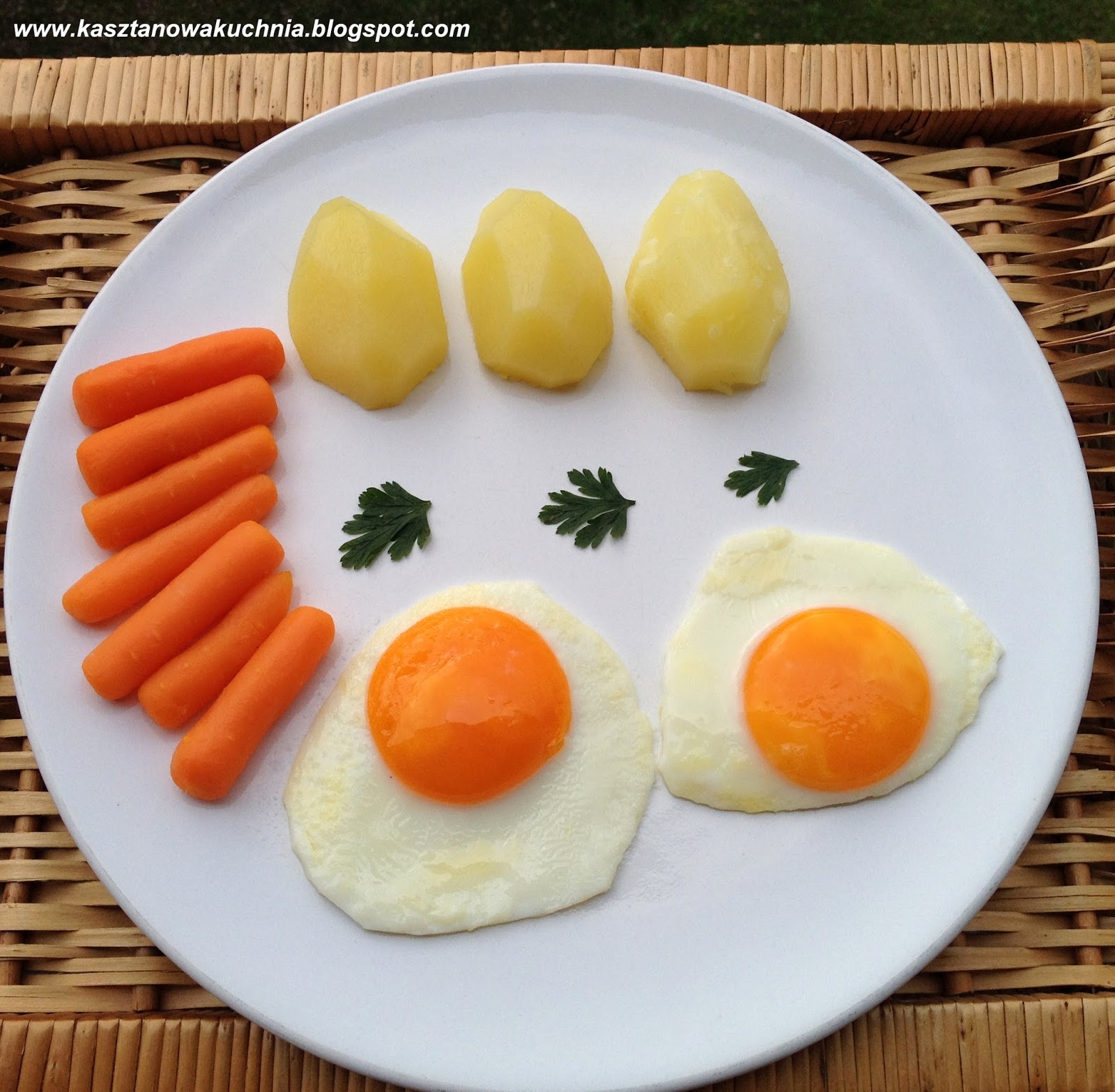 Jajka sadzone podajemy z wybranymi dodatkami. W tym przypadku prezentuję jajka sadzone podane z ziemniakami i gotowaną marchewką.