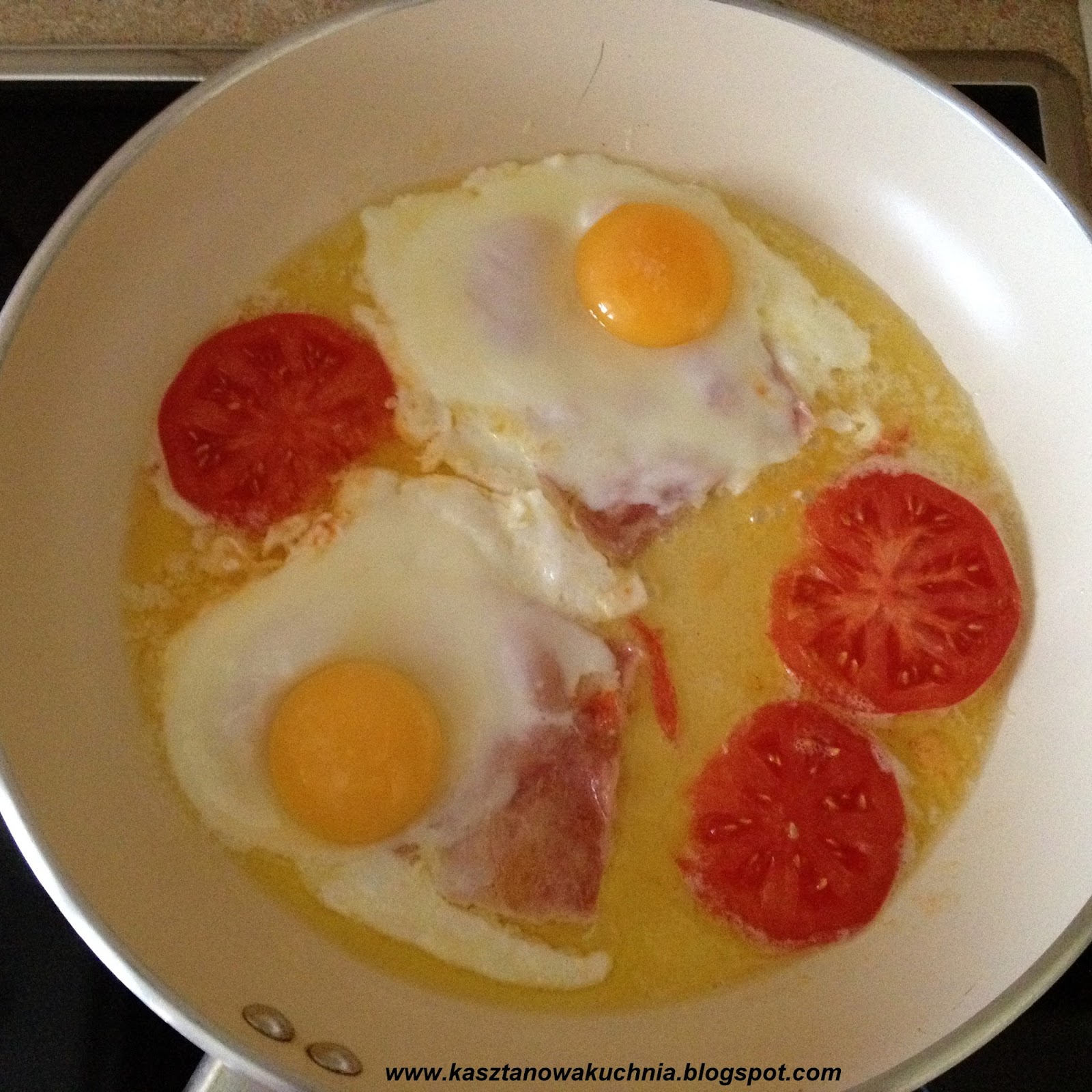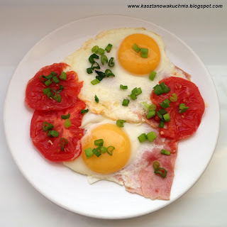 Cześć =) Dziś chciałbym zaprezentować ciekawy pomysł na śniadanie (albo kolację), oparty na jajku, wędlinie i pomidorze.