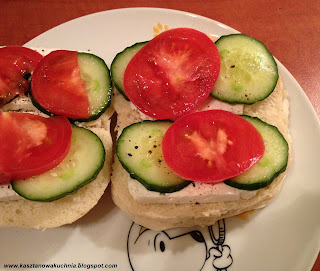 Moje dzisiejsze kanapki, to bułki z białym serem, ogórkiem i pomidorem.