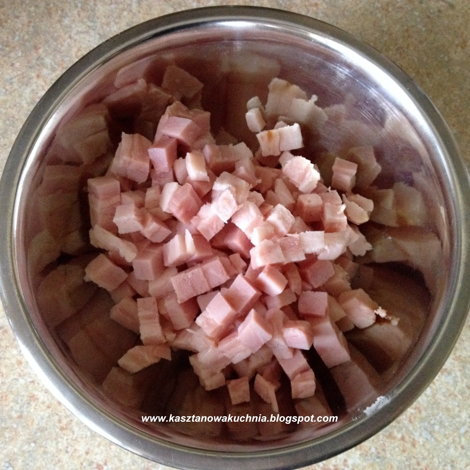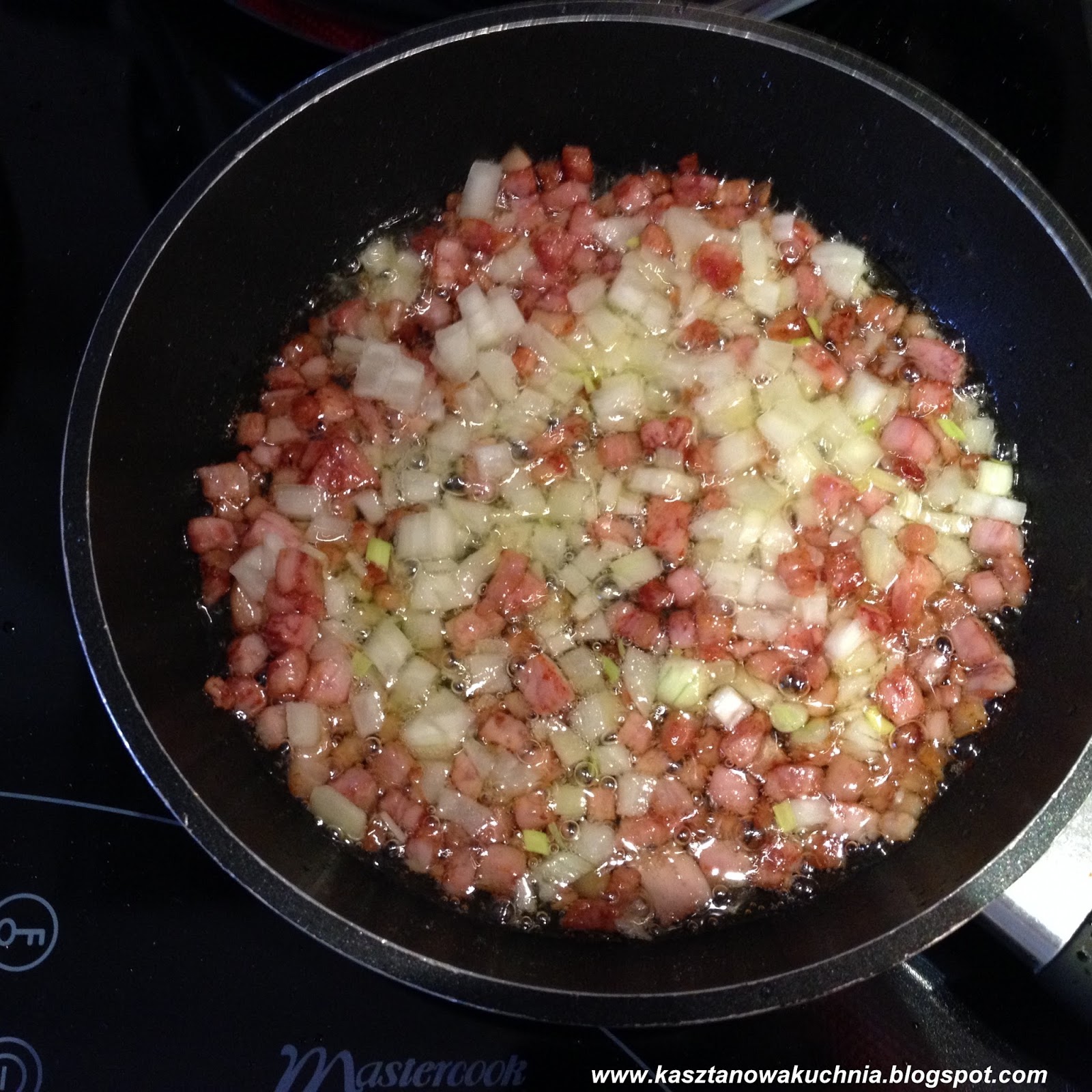 7) Boczek pokroić w kostkę, a następnie usmażyć go na skwarki.