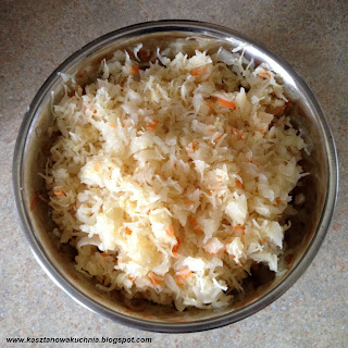 8) Kapustę kiszoną i cebulę posiekać i podsmażyć całość, aż do zarumienienia się kapusty.