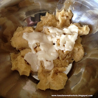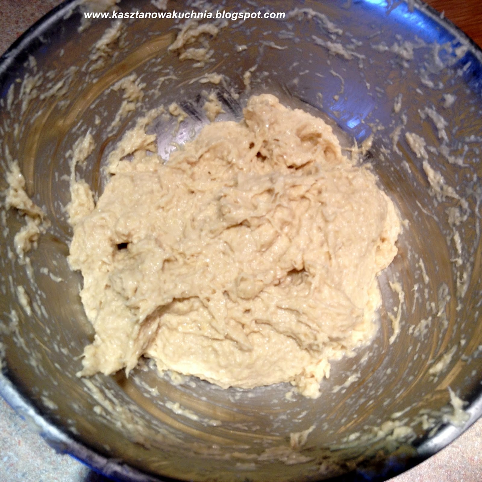 4) Dodać jajko, sól, mąkę i wyrobić ciasto. Powinno mieć taką konsystencję, żeby odchodziło od łyżki po jej potrząśnięciu.