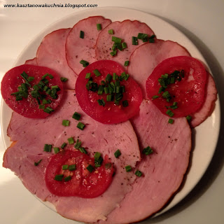 Zawsze, gdy przyjeżdżam na Kujawy - matka kupuje różne i smaczne rzeczy. Tym razem zjadłem kiełbasę krakowską suchą, szynkę ze sklepu "na rogu" oraz pomidory malinowe ze szczypiorkiem. Całość posypana świeżo zmielonym pieprzem.
