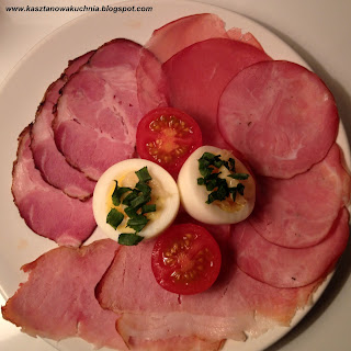 Zawsze, gdy przyjeżdżam na Kujawy - matka kupuje różne i smaczne rzeczy. Tym razem zjadłem kiełbasę krakowską suchą, szynkę ze sklepu "na rogu", szynkę pieczoną, polędwicę wędzoną, jajko na twardo z majonezem i szczypiorkiem oraz pomidorka koktajlowego.