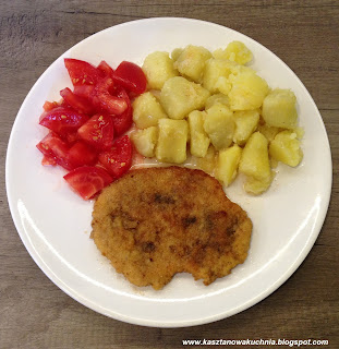 W tej wersji kotlet schabowy podałem z surówką z pomidora oraz ziemniakami.