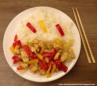 1) Kurczaka kroimy w małe, skośne kawałki (takie jak do pałeczek), dodajemy curry i paprykę, po czym mieszamy.