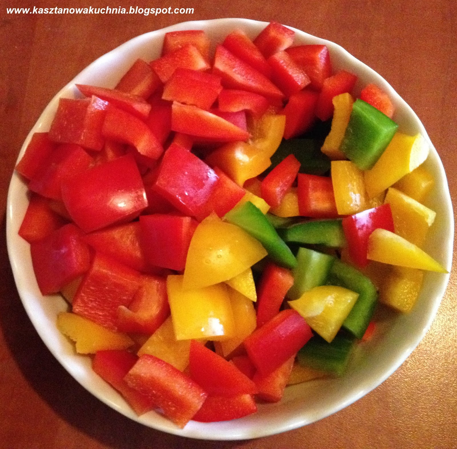 1) Paprykę wyfiletować z nasion i białych błonek, a następnie pokroić w kawałki o szerokości 1 cm.