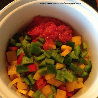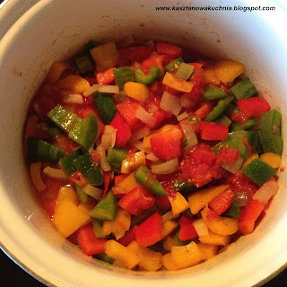 6) Dodać pokrojoną paprykę, pomidory, doprawić solą i pieprzem.