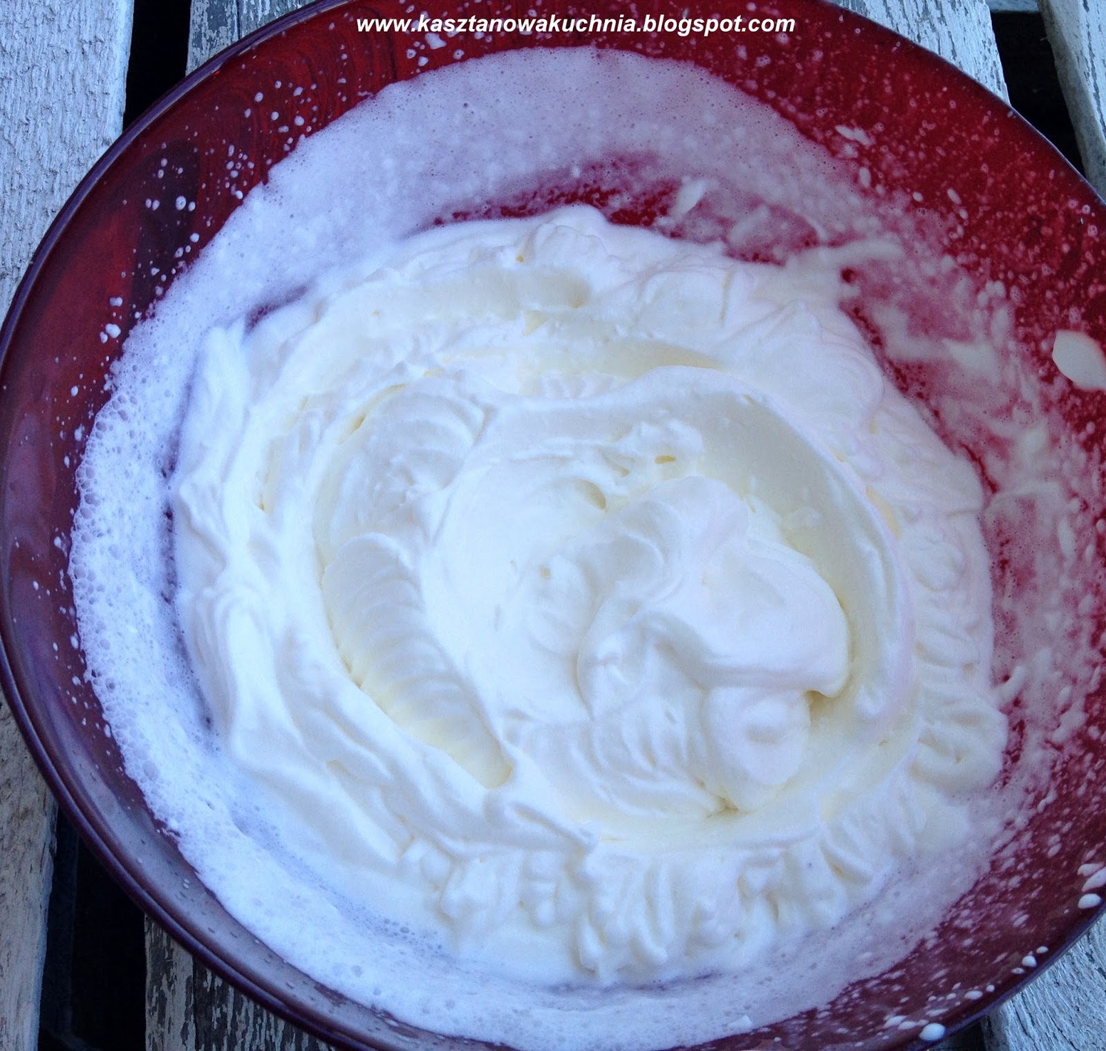 2) Zimną kremówkę ubijamy na sztywno, po czym dodajemy porcjami do masy truskawkowej, mieszając silikonową łopatką.