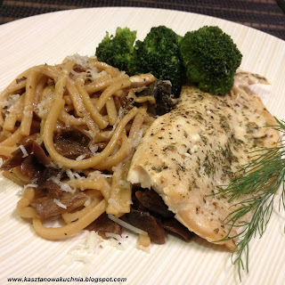 Cześć =) Grzyby leśne, najlepiej borowiki lub podgrzybki, zmieszane z makaronem to smakowity dodatek do prostych dań mięsnych lub rybnych. Aromatyczna woda z duszenia grzybów przenika do makaronu, nadając mu lekko brązowy kolor i leśny, grzybowy smak. Do takiego makaronu można również wbić jajka oraz dodać trochę startego sera. Wtedy, z dodatkiem już jedynie surówki lub dowolnych warzyw, stanowi pełny posiłek =)