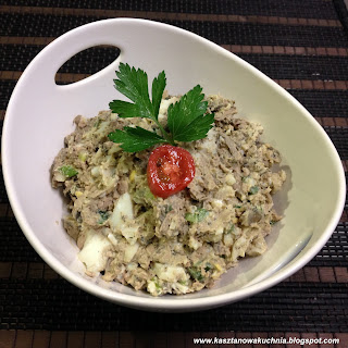5) W misce mieszamy wątróbki z jajkiem, szczypiorem oraz majonezem i musztardą. Ilość majonezu i musztardy regulujemy według własnych upodobań smakowych. W razie konieczności, po spróbowaniu na końcu, dodajemy sól i pieprz.