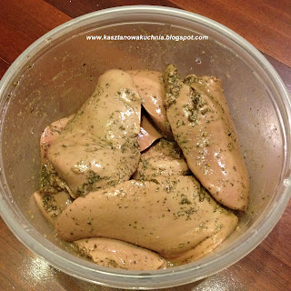 2) Dodajemy oliwę i zioła, mieszamy dokładnie i odstawiamy w temperaturze pokojowej na 30-40 minut. Przed samym smażeniem oprószamy solą i pieprzem.