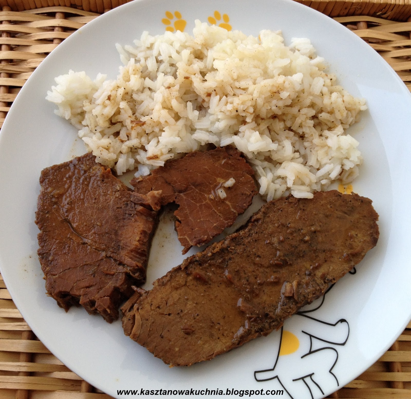 Świetnie smakuje z ulubionymi warzywami i kartoflami, polanymi sosem. W tej wersji podałem pieczeń wołową z ryżem, polanym sosem z pieczeni.