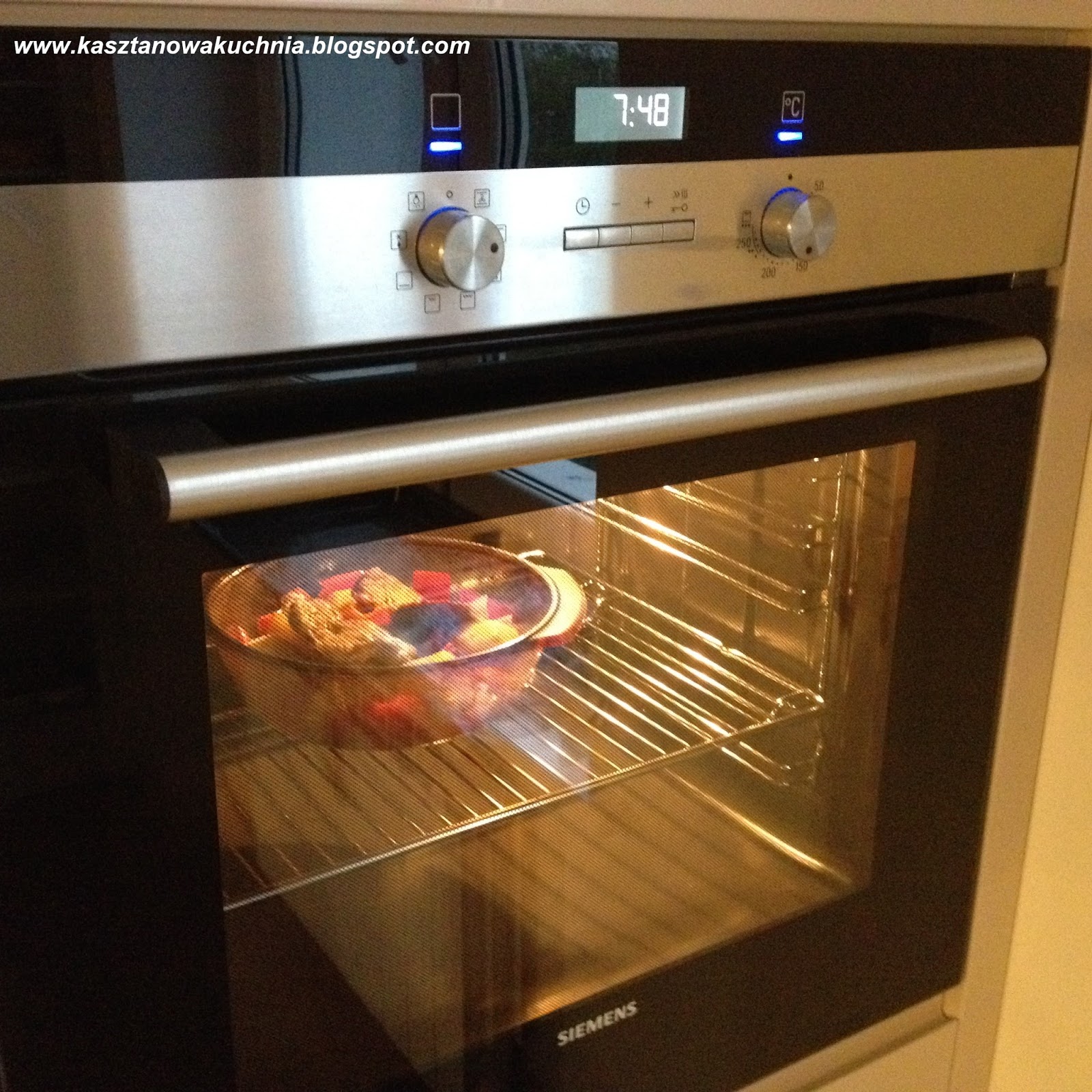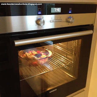 4) Piekarnik rozgrzewamy do 180-190 stopni C, a następnie wkładamy do niego naczynie i pieczemy 1 godzinę i 30 minut.