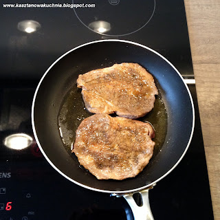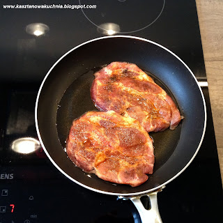 3) Na patelni rozgrzewamy oliwę, a następnie podsmażamy plastry karkówki z obu stron, po czym przekładamy wszystko do naczynia żaroodpornego, dodajemy ziemniaki i podlewamy lekko wodą.