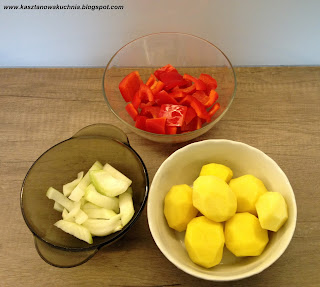 2) W międzyczasie kroimy paprykę i cebulę w średnią kostkę. Ziemniaki obieramy i również kroimy w dowolnej wielkości kawałki.