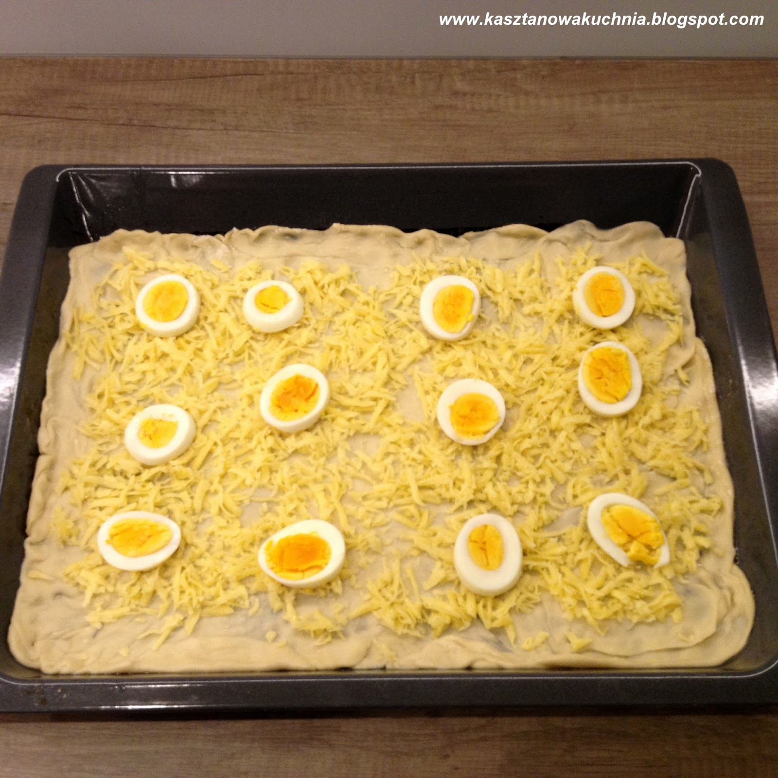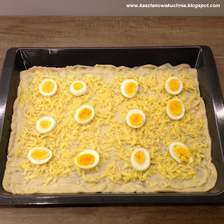 7) Ciasto urabiamy, wałkujemy wałkiem na cienką warstwę, rozprowadzamy na lekko skropionej tłuszczem blasze, posypujemy serem oraz pozostałymi składnikami, a na końcu znów serem.