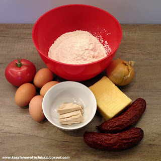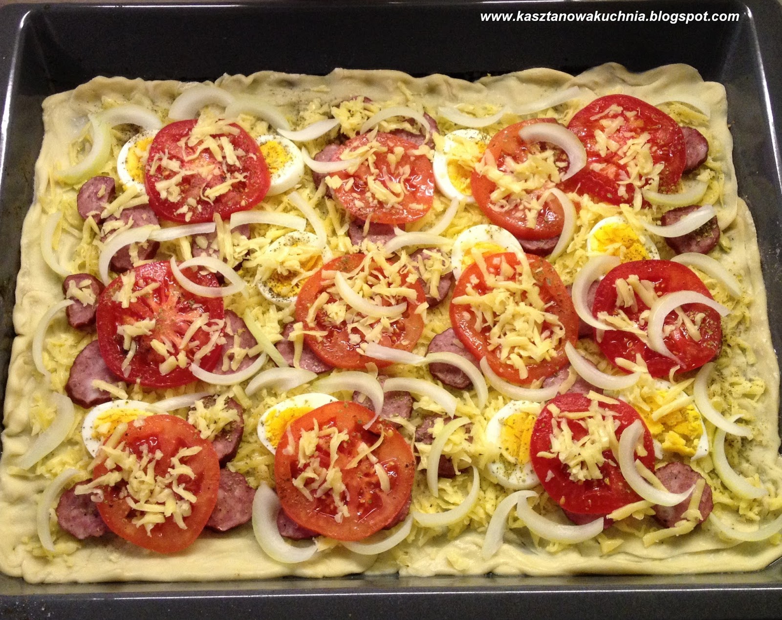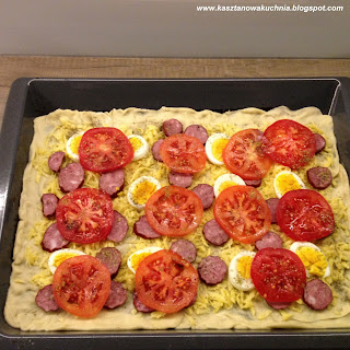 6) Kiedy ciasto rośnie, przygotowujemy składniki na pizze: ugotowane na twardo jajka pokrojone w plastry, kiełbasa myśliwska pokrojona w plastry, cebula pokrojona w piórka, starty ser, pomidor pokrojony w plastry.