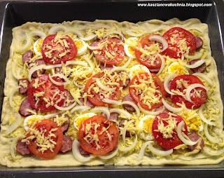 7) Ciasto urabiamy, wałkujemy wałkiem na cienką warstwę, rozprowadzamy na lekko skropionej tłuszczem blasze, posypujemy serem oraz pozostałymi składnikami, a na końcu znów serem.