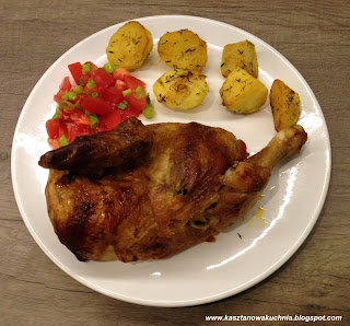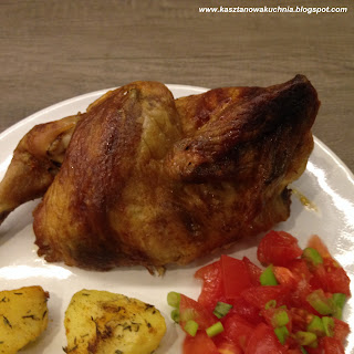 Pół kurczaka podałem w towarzystwie pieczonych ziemniaków oraz surówki z pomidora i szczypiorku.