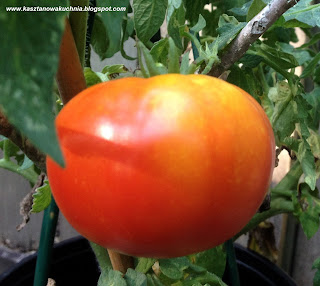 Cześć =) Pomidory, to ulubione warzywa Kasztanowej Kuchni. Mamy wielki zaszczyt oznajmić, że Kasztanowa Kuchnia rozpoczęła hodowlę warzyw w ogrodzie. Z tej okazji pragniemy zaprezentować pierwszego pomidora, prosto z krzaka. Pojawił się jakiś miesiąc temu, jako mała, zielona kulka i tak sobie pomału dojrzewał. Długi czas, był zielony, a potem pięknie się zarumienił. Trzy następne czekają w kolejce.
