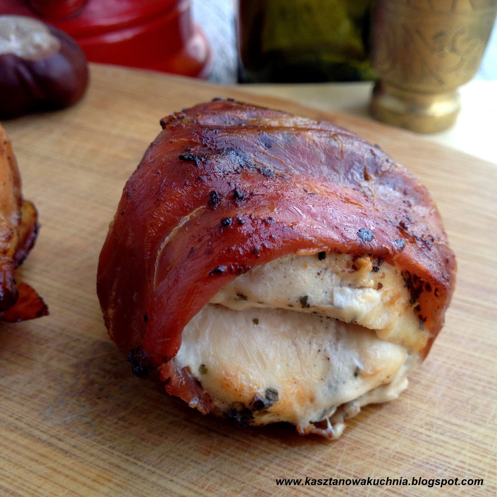 1) Każdą część filetu z kurczaka posypujemy pieprzem (sól jest zbędna ze względu na słoność szynki) i bazylią (lub układamy na wierzch listki bazylii), po czym zawijamy w plaster lub plastry szynki tak, aby złączenie końców szynki było na spodzie.