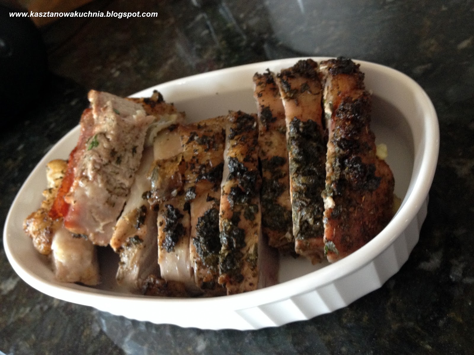 1) Schab marynujemy w przyprawach, soku z cytryny i oliwie przynajmniej dobę, a nawet dwie.