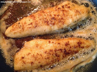 2) Na rozgrzaną patelnię dodajemy 3 łyżki masła, po czym smażymy ryby po około 3-4 minuty z każdej strony.