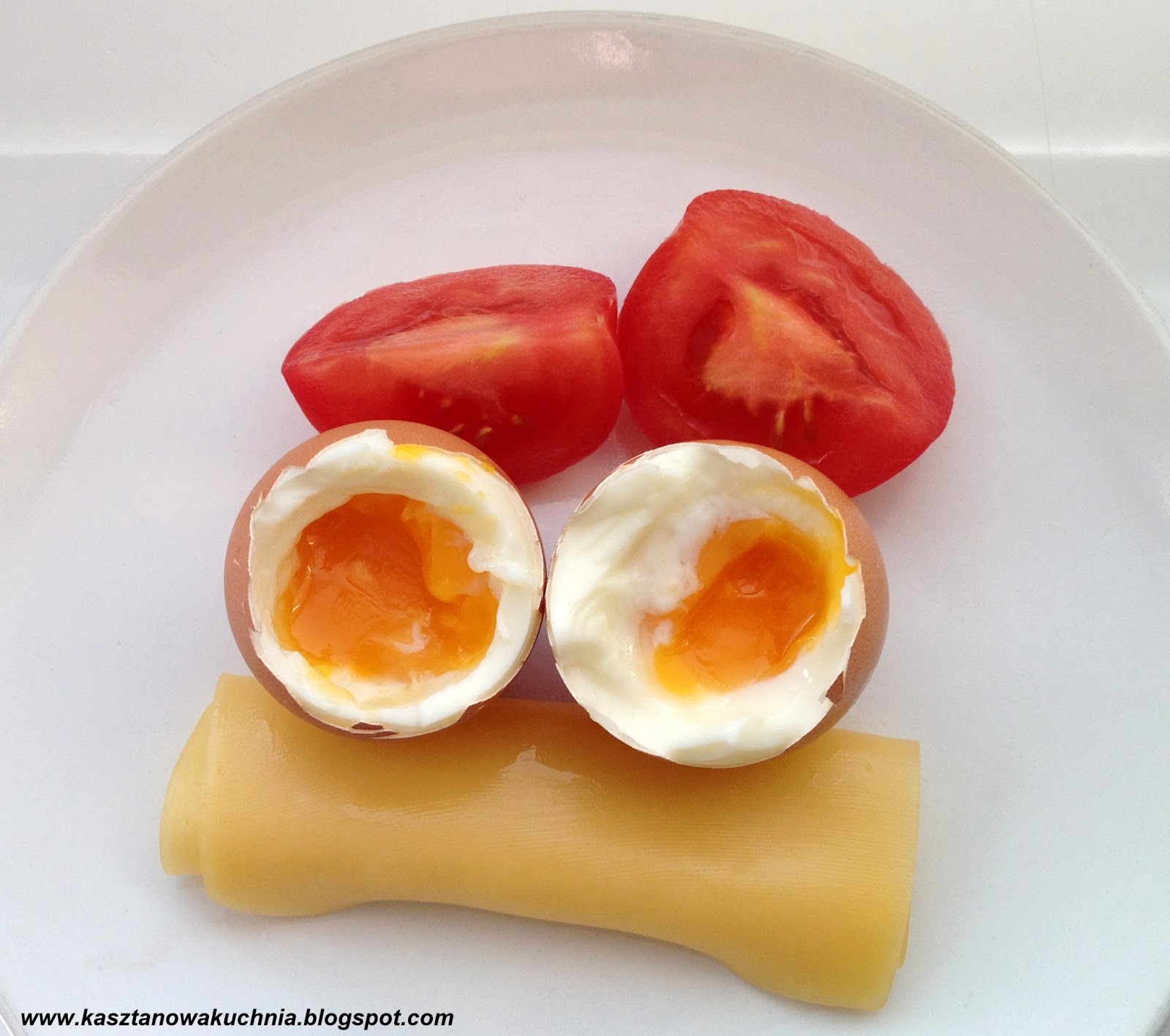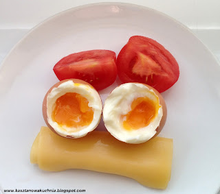 Dziś chciałbym przedstawić jedno z moich ulubionych śniadań, czyli jajka na półmiękko, plasterek żółtego sera i dwie ćwiartki pomidora malinowego.