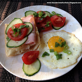 Dziś zapraszam na śniadanie, na które składają się: kanapka z szynką, ogórkiem, pomidorem i szczypiorkiem oraz jajko sadzone.