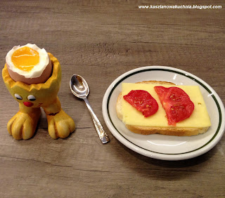 Dziś zapraszam na śniadanie, na które składają się: jajko na miękko oraz kanapka z żółtym serem i pomidorem malinowym.