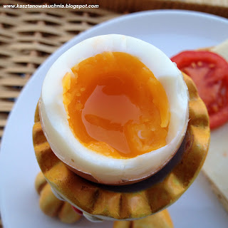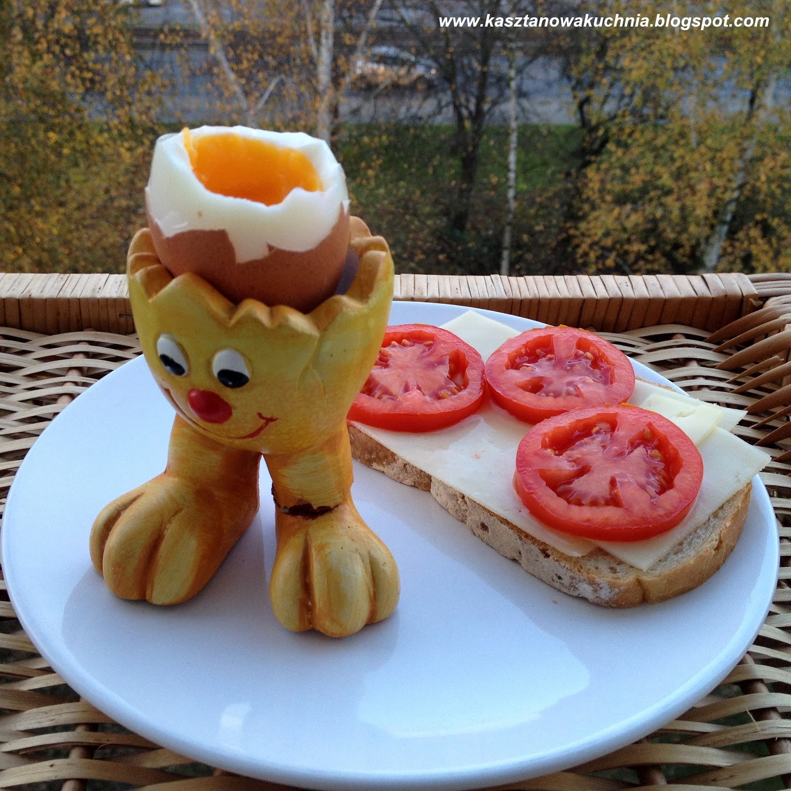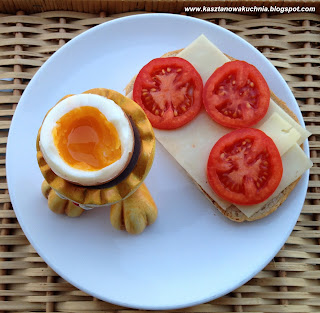 Dziś zapraszam na śniadanie, na które składają się: jajko na miękko oraz kanapka z serem i pomidorem.