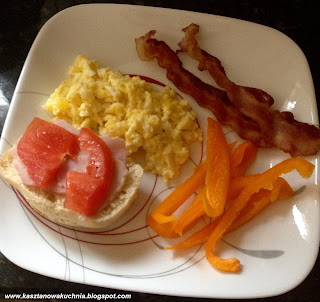 Dziś zapraszam na śniadanie, na które składają się: jajecznica, 2 plasterki bekonu, kanapka z szynką i pomidorem oraz kilka pasków papryki.
