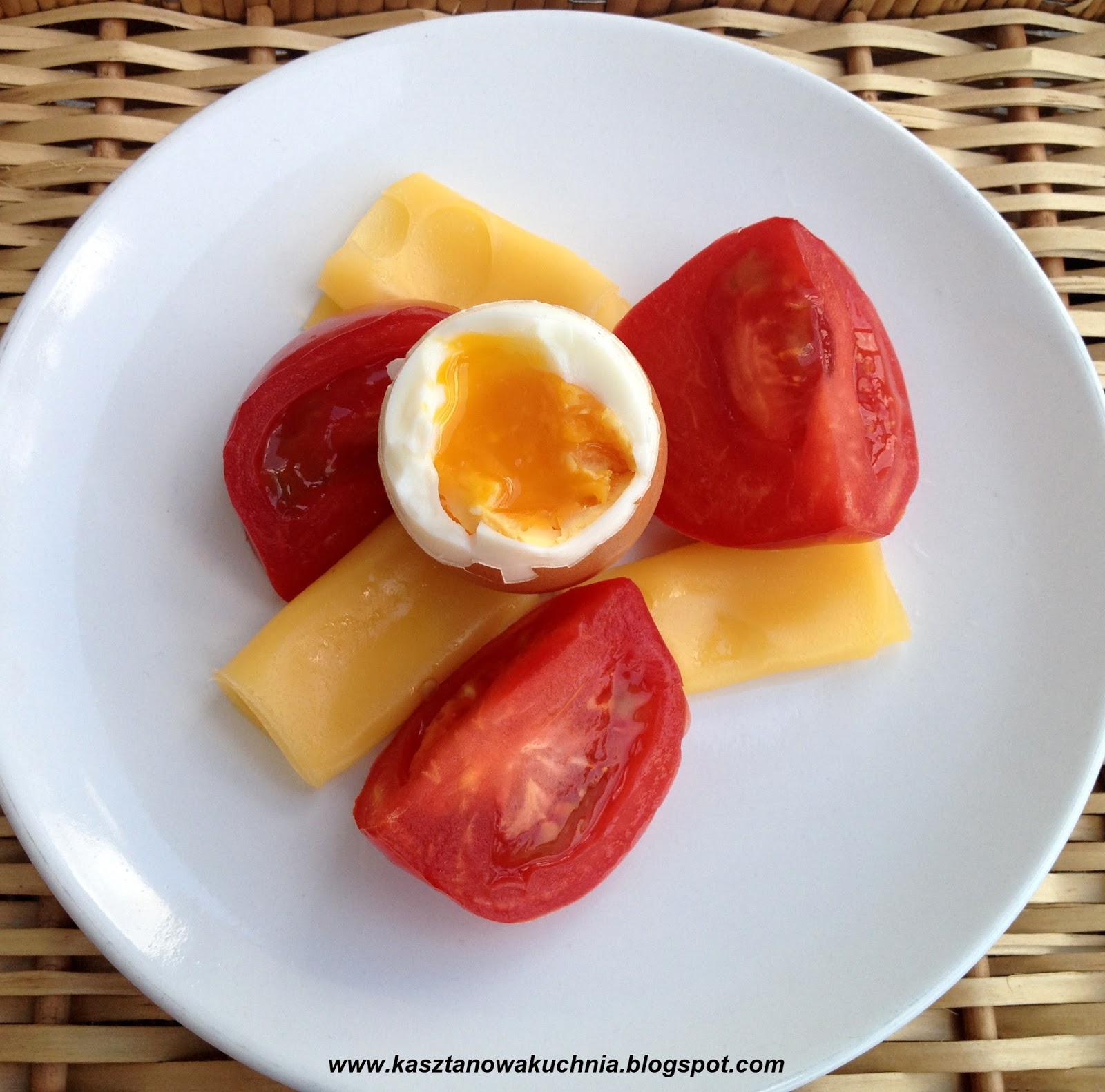 Dziś zapraszam na śniadanie, na które składają się: jajko od kury podwórkowej ugotowane na półmiękko, ser żółty oraz pomidor malinowy.