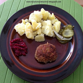 Podczas ostatniej wizyty u babci Krysi, babcia podała mi i cioci Sławce kotlety mielone z ćwikłą, ogórkiem konserwowym i ziemniakami.