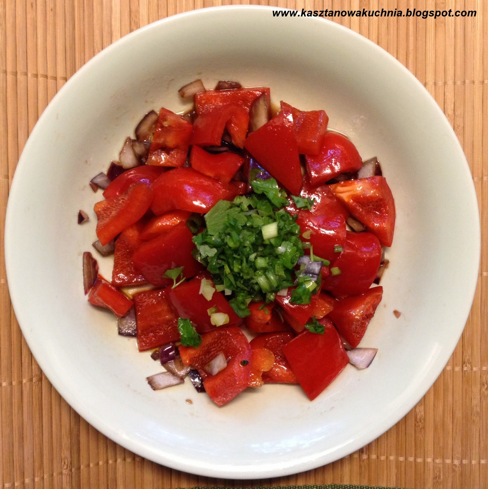 1) Paprykę i cebulę wkładamy do miski, skrapiamy oliwa i octem balsamicznym (oliwy i octu mniej więcej 2/1).