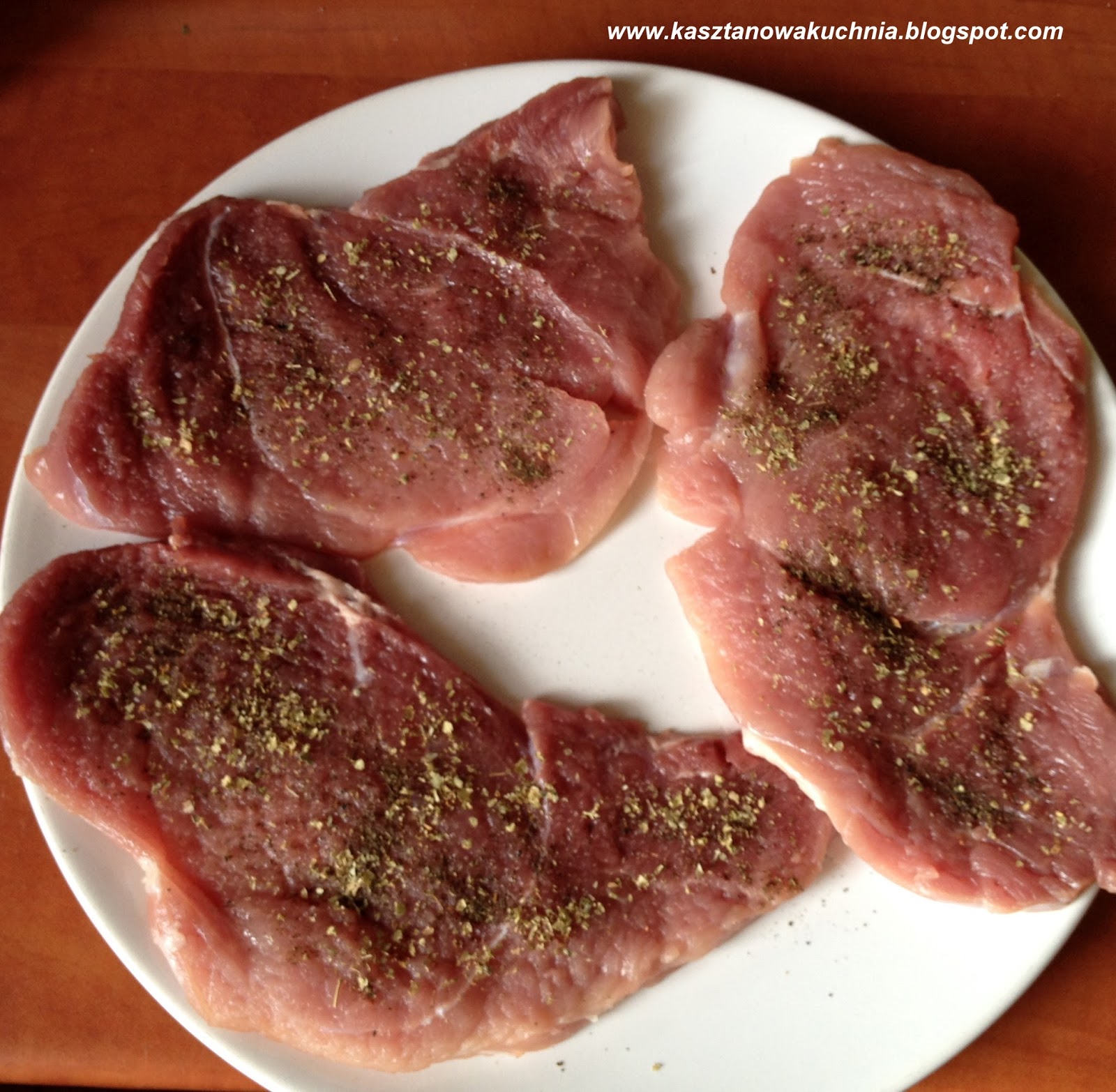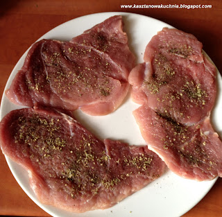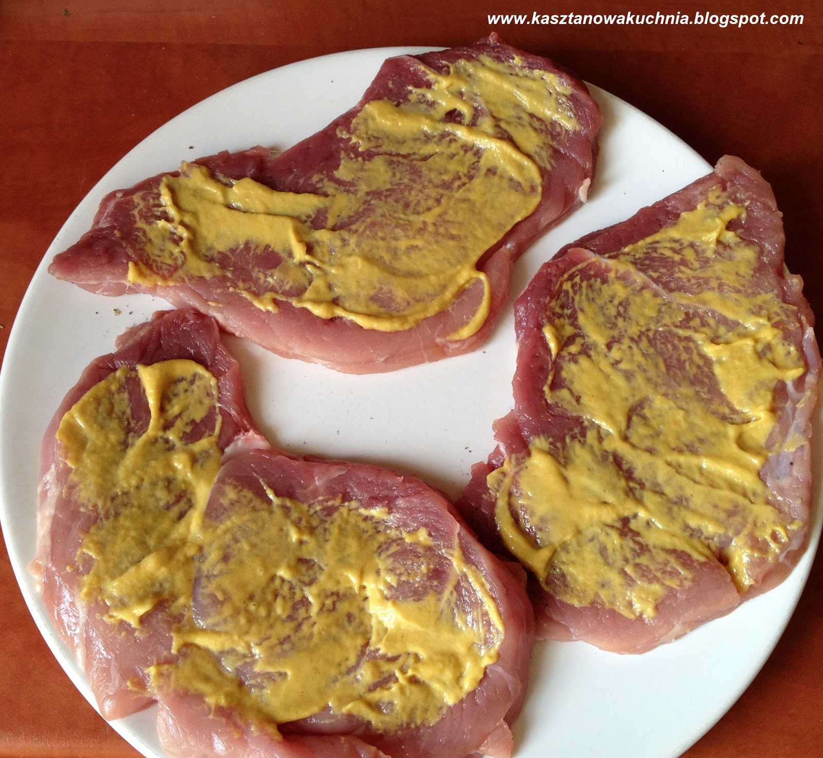 1) Mięso rozbijamy delikatnie tłuczkiem na cienkie plasterki (około 5 mm) i z jednej strony posypujemy solą, pieprzem i majerankiem, a z drugiej smarujemy musztardą.
