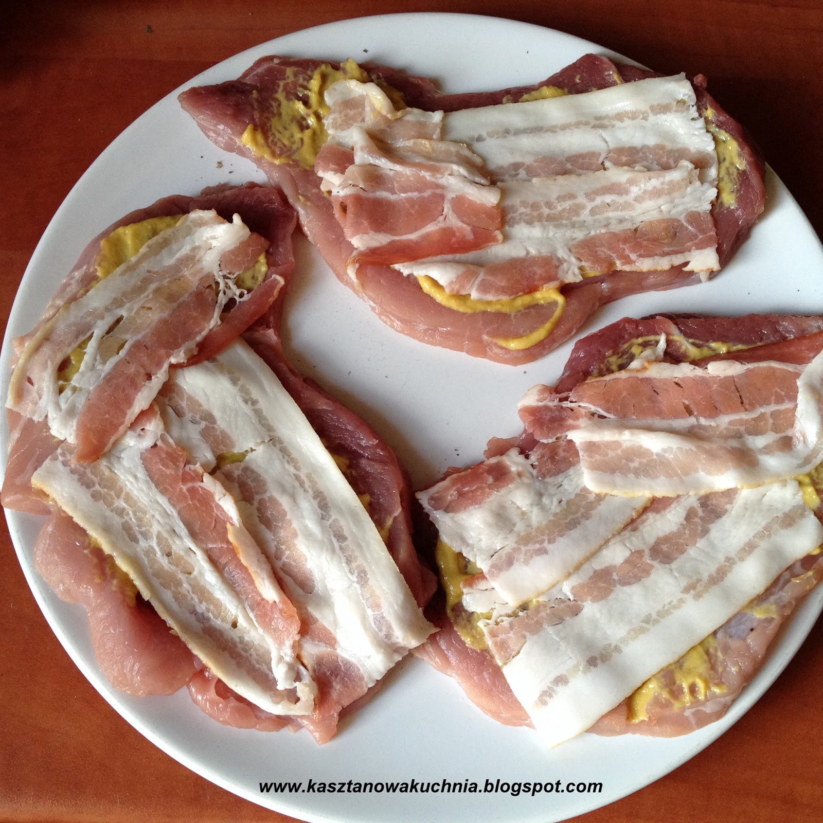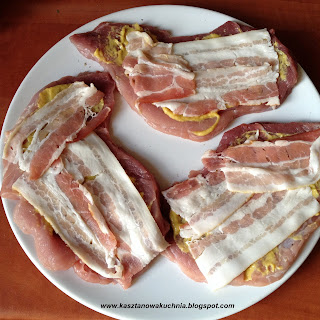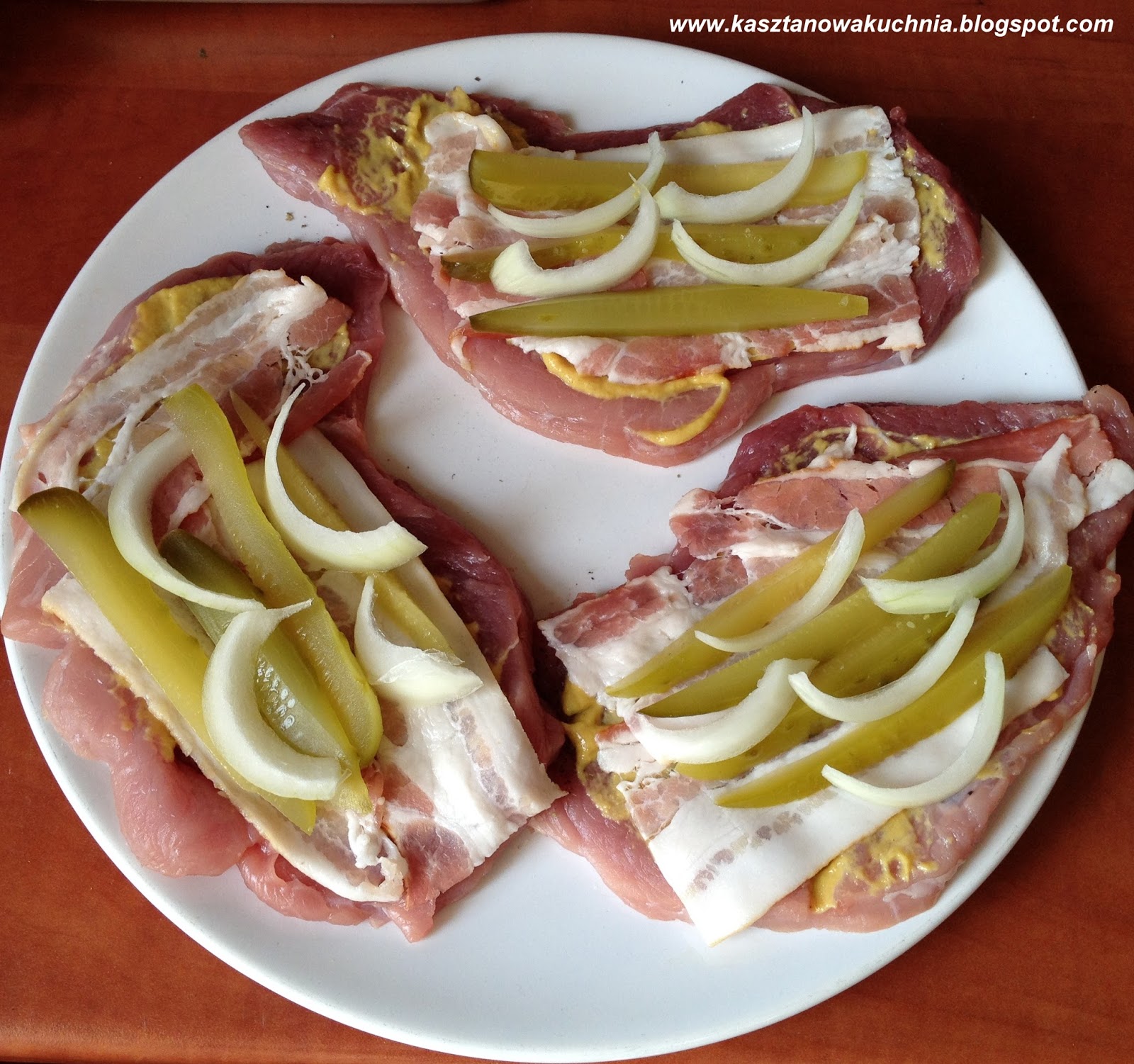 3) Na posmarowanym musztardą mięsie układamy plaster boczku (lub 1-2 paski boczku pokrojonego w paski), kilka pasków ogórka i cebuli, a następnie zawijamy brzegi i zwijamy je w roladkę i spinamy wykałaczką.