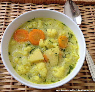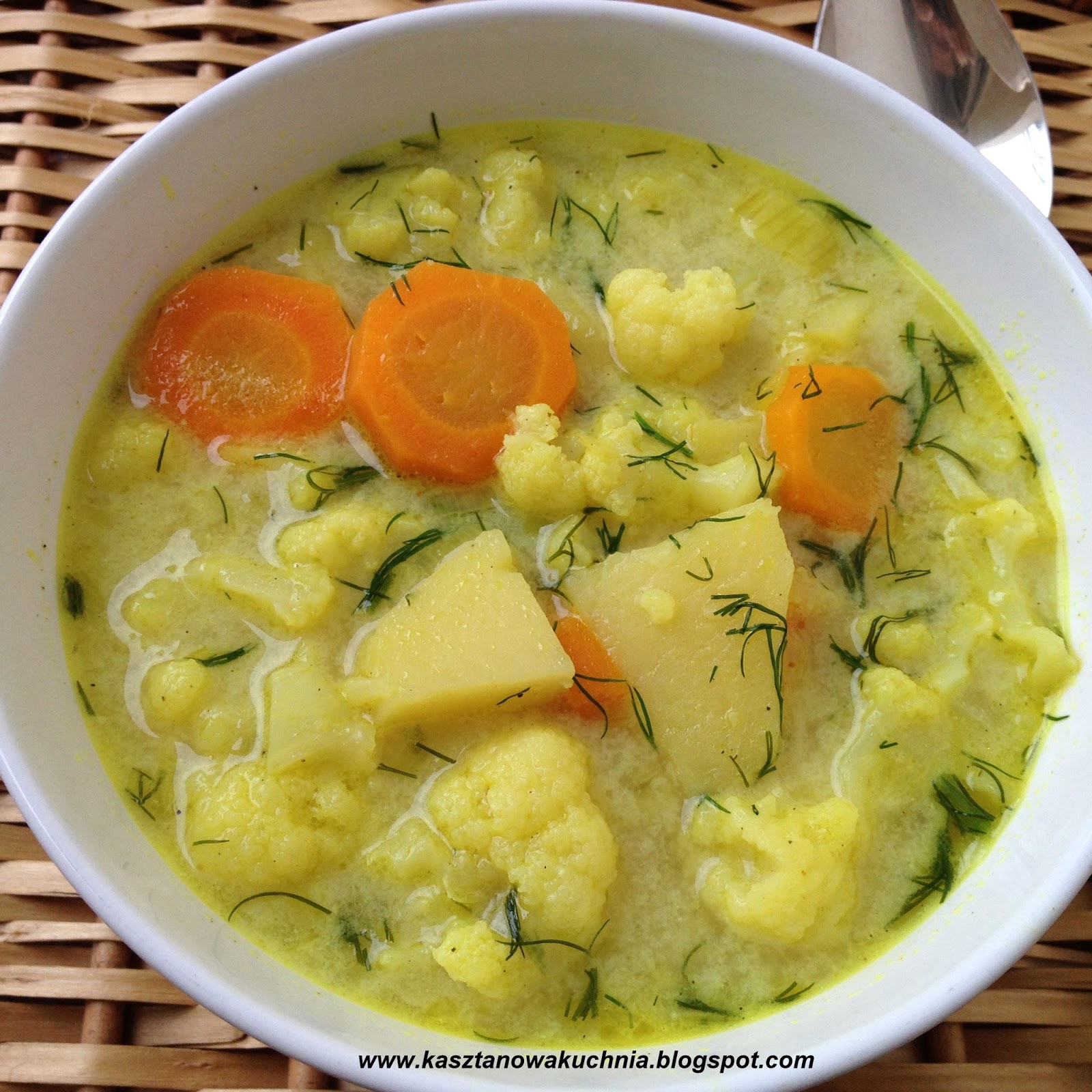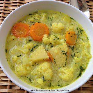 Cześć =) Zupa kalafiorowa gości na moim stole od dawna. Czasem robię ją na kurczaku, ale wersja bezmięsna jest również wspaniała. Dodatek kurkumy sprawia, że ma niesamowicie atrakcyjny, wiosenno-letni kolor i jest bardzo słoneczna.