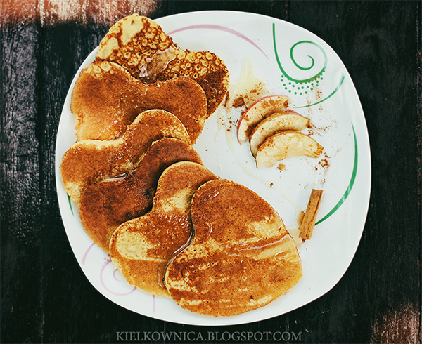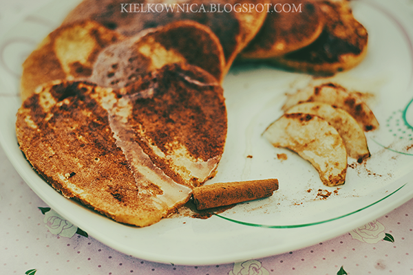 Dzisiejsza pogoda nie umiliła mi wczesnej pobudki, więc postanowiłam osłodzić sobie życie sama. Spoglądając na mokre od deszczu szyby, doszłam do wniosku, że nic nie zmusi mnie do opuszczenia domu. Wygrzebałam więc z szafki kilka jabłek i kaszę jaglaną - idealnie na naleśniki.