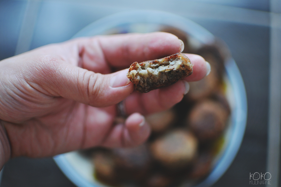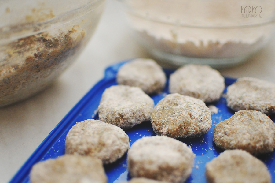 - Formujemy wilgotnymi rękami malutkie placuszki które obtaczamy mąką.